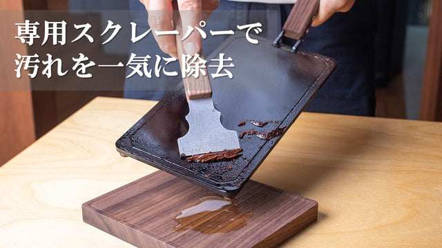 The trick to cleaning is to apply a little oil while it's still warm, and press it firmly with a special scraper to remove it.